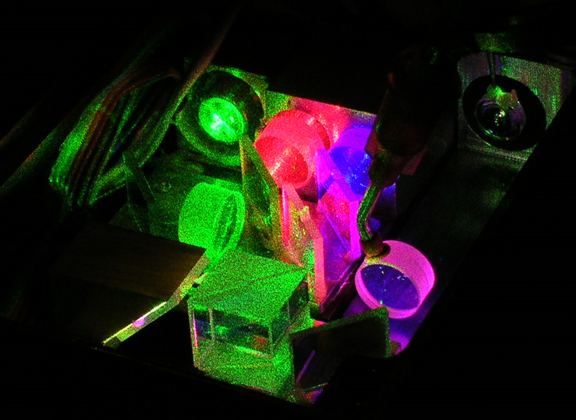Prototype assembly of an micro-optical visible RGB module for use in laser projectors.